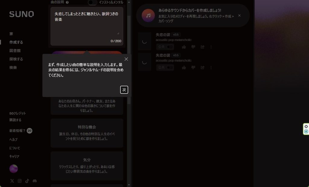 まず、作成したい曲の簡単な説明を入力します。最良の結果を得るには、ジャンルやムードの説明を含めてください。
