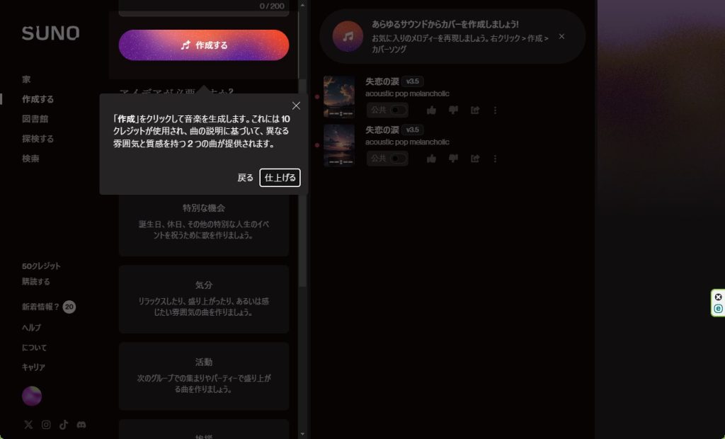 10クレジットと書いてありますが、実際は1日50クレジットのようです。そして50クレジットとは、10曲分作成できるということを意味します。1回で2曲作成してくれるので、5回分ということになります。