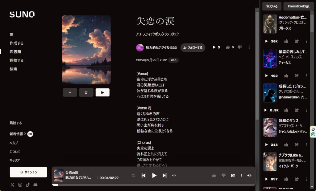 AI作詞作曲サイト『Suno』は、入力したキーワードに基づき、AIが自動で歌詞やメロディを生成する音楽制作プラットフォームです。