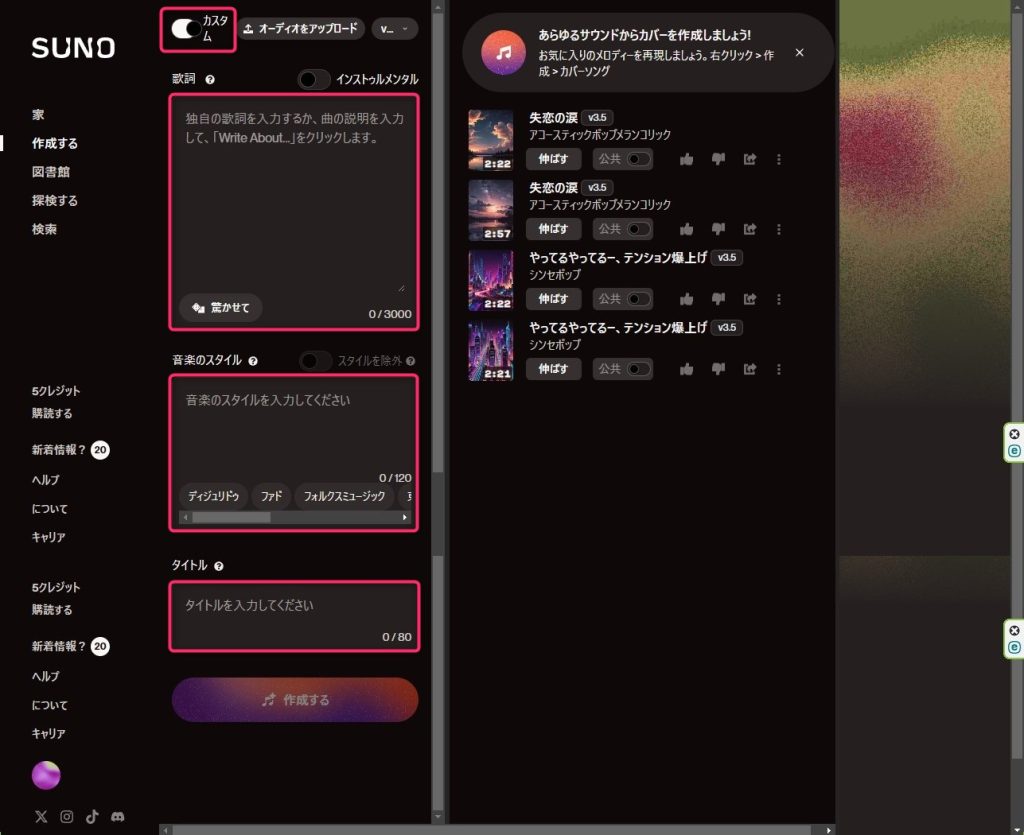 左のタブの、作成するをクリックすると、デフォルトではカスタムでの作詞作曲モードになっています。
