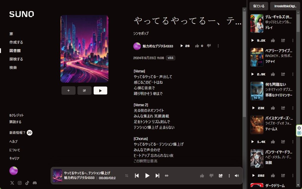 楽しくて作成しているとすぐに50クレジット(10曲分、1回で2曲作成されるので合計5回分)使い切ってしまいますが、1日経てばクレジットは回復するようです。