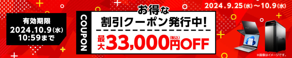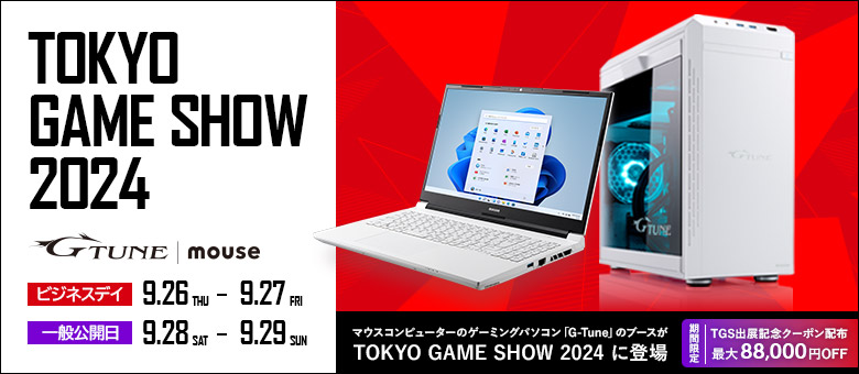 TOKYO GAME SHOW 2024のブース出展を記念して、最大88,000円OFFのクーポンを配布中です。期間は2024年10月9日 10:59までと、非常に限定されています。この機会にぜひ、お得な価格で新しいPCを手に入れてください!