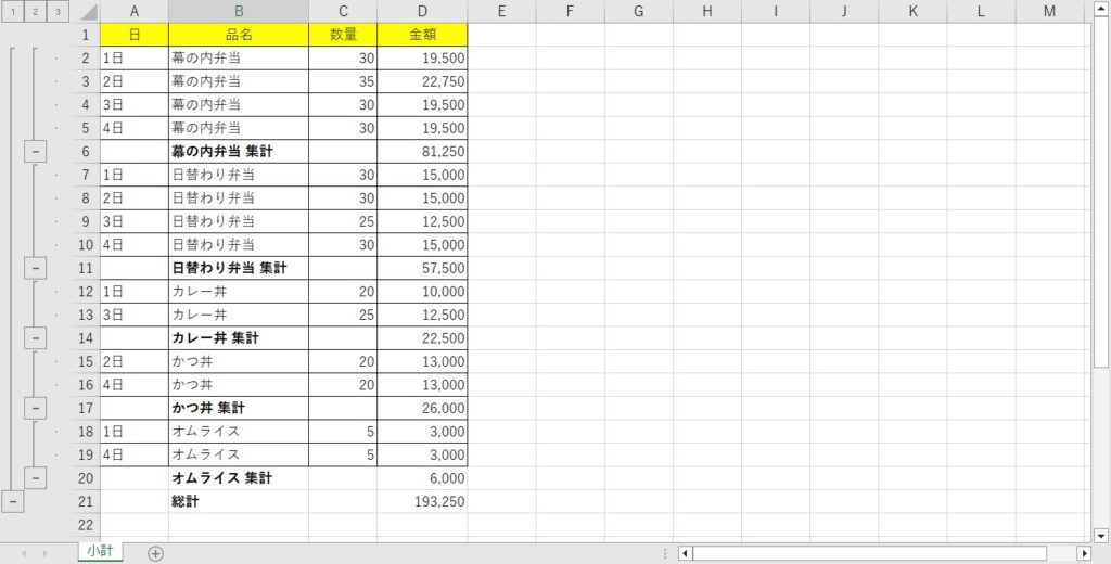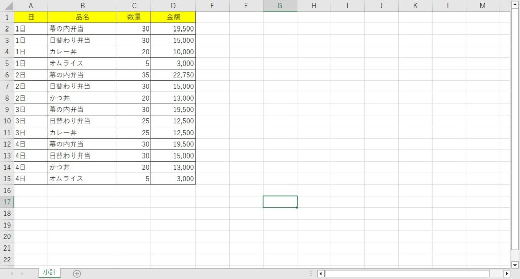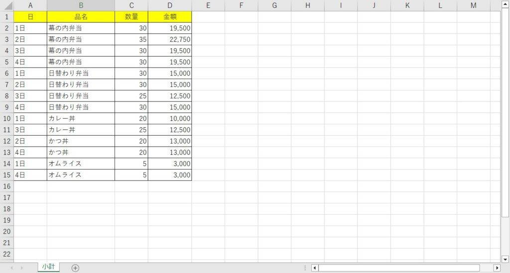 このブログでの目的である「品名」ごとの「合計」の金額を集計するために、小計を計算していきます。