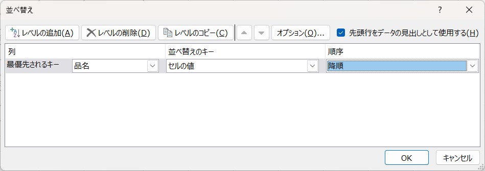 「品名」の降順で並べ替えが行われたことが確認できます。