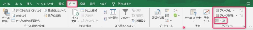 それは、[データ]タブの[アウトライン]グループの中にあります。Excelの横幅が狭いと簡易表示になって[小計]が隠れていることがあります。そのときは、アウトラインという文字の横にある下三角ボタンをクリックすると[小計]が現れます。