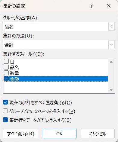 「品名」を基準として、「金額」の「合計」を集計するという意味になります。