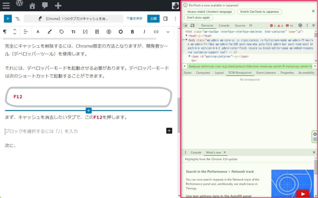 完全にキャッシュを削除するには、開発者ツール(デベロッパーツール)を使用します。