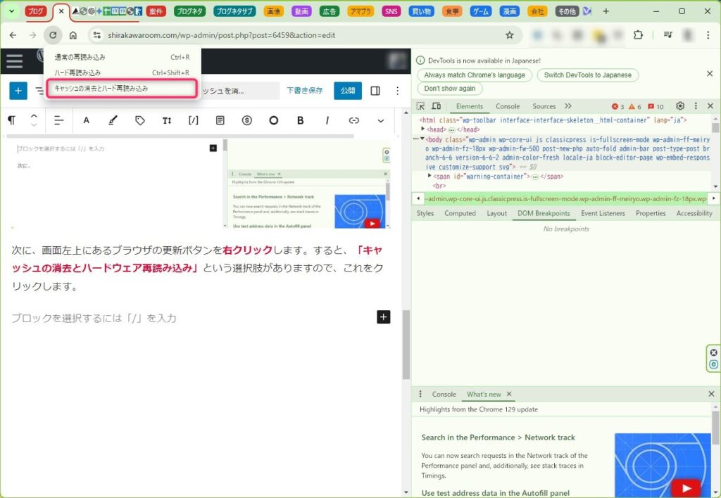 次に、画面左上にあるブラウザの更新ボタンを右クリックします。すると、「キャッシュの消去とハードウェア再読み込み」という選択肢がありますので、これをクリックします。