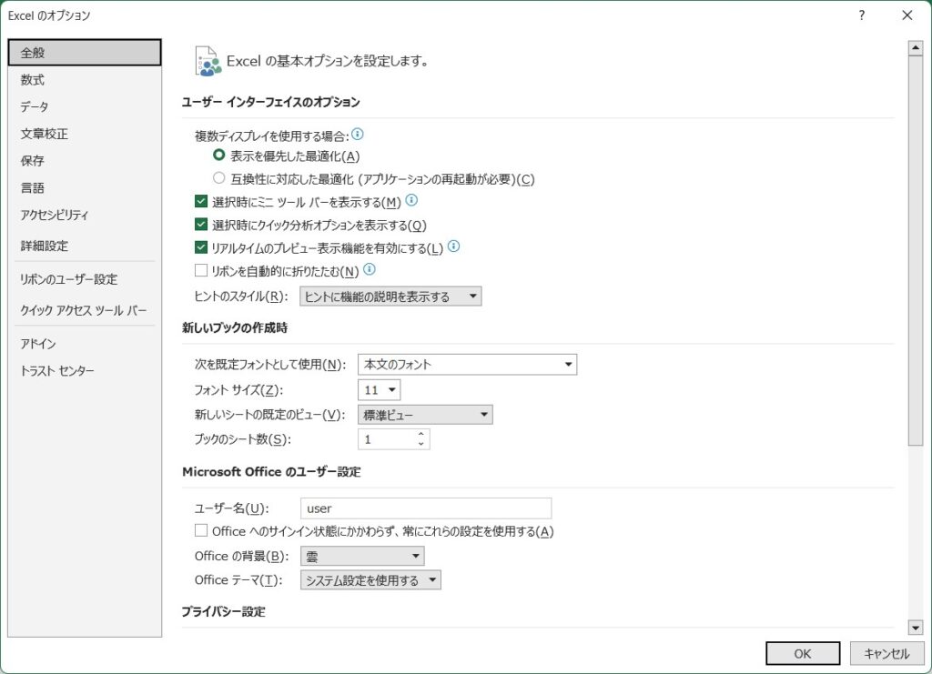 Excelを開きましたら、[ファイル]タブをクリックし、[オプション]または[その他]の中の[オプション]を開きます。