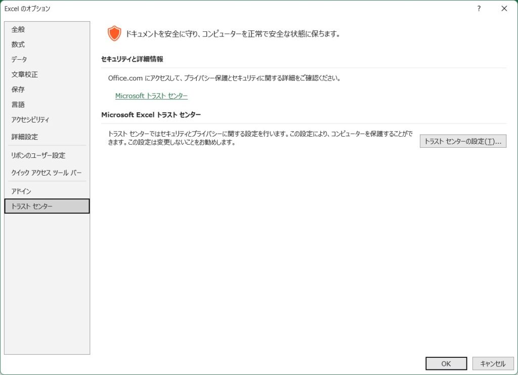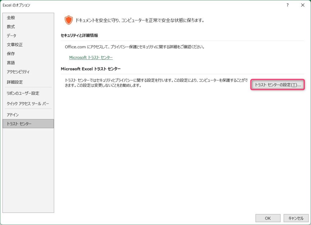 [トラスト センターの設定]をクリックし、トラスト センターの設定を行います。