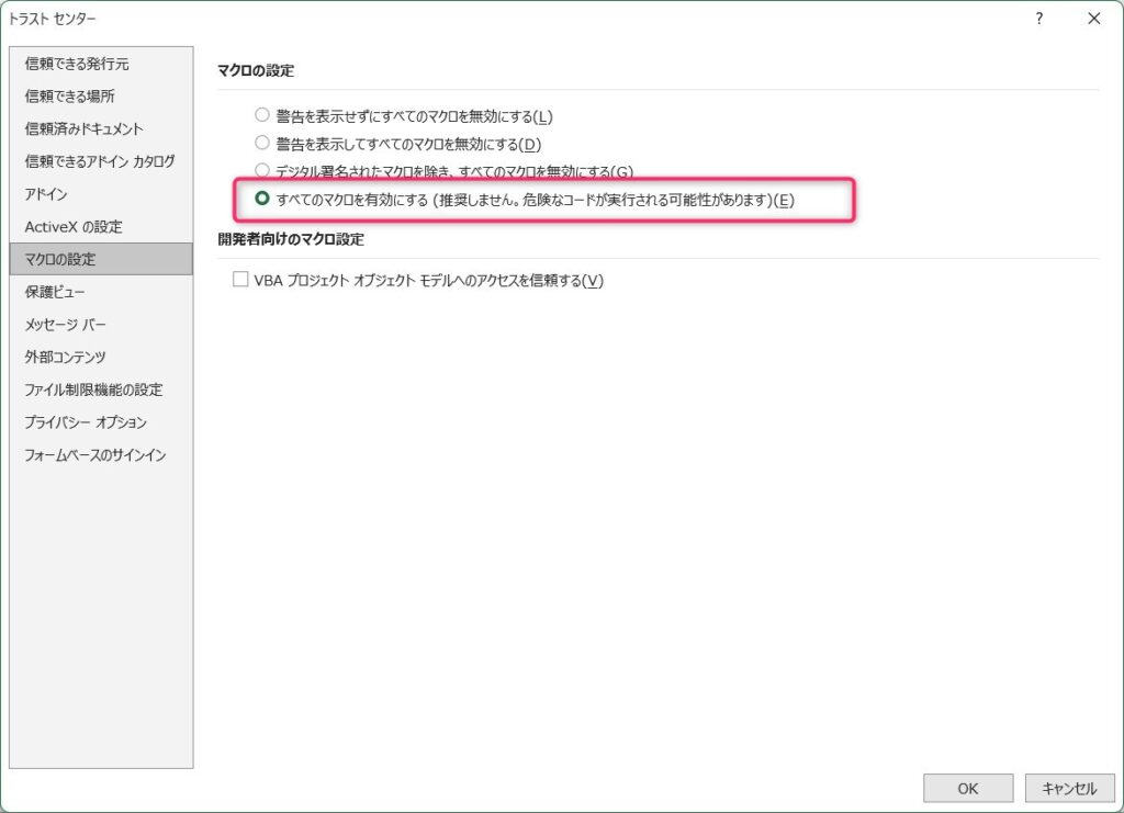 - すべてのマクロを有効にする(推奨しません。危険なコードが実行される可能性があります)