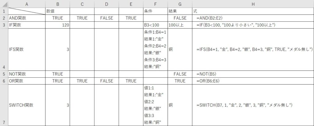 AND関数、NOT関数、OR関数は、IF関数、IFS関数、SWITCH関数の中で使用されることが多い関数です。